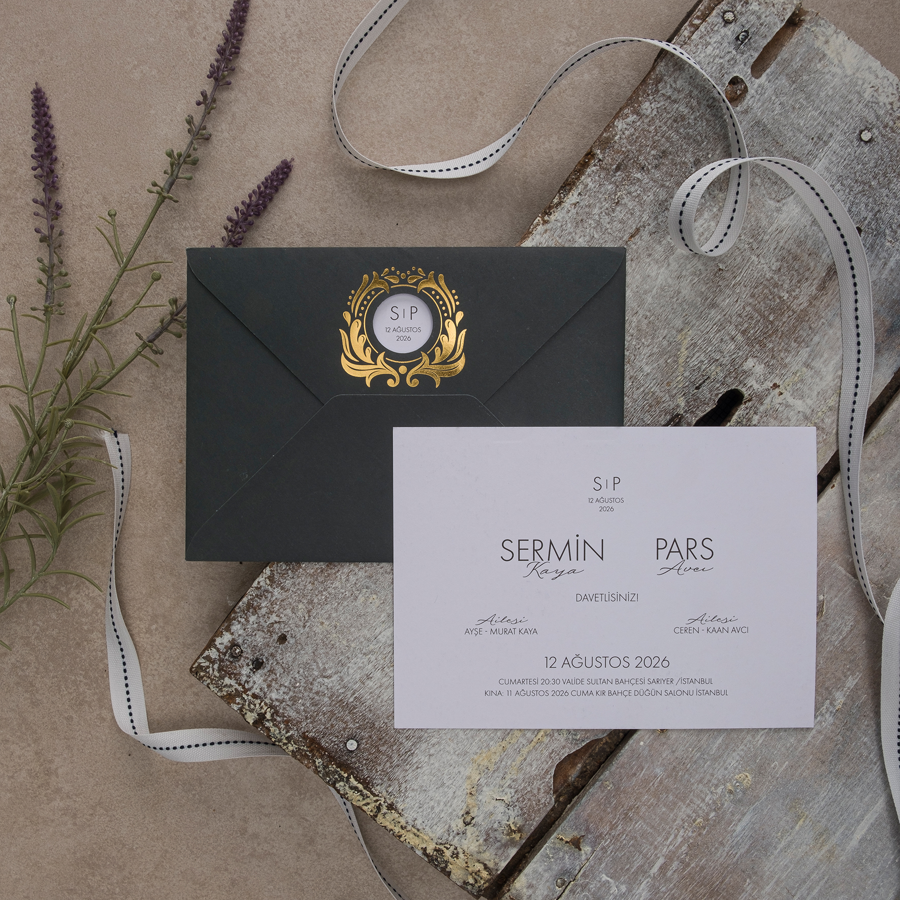 • Davetiye kutulu olarak tasarlanmış olup zarf ve aksesuarları içerisinde bulunmaktadır.